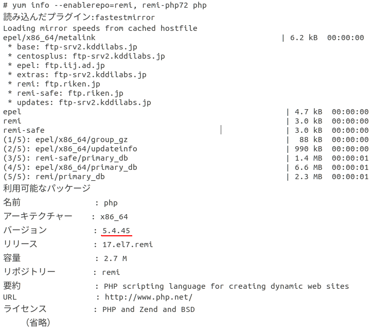 あれ?このままだとPHP5.4.45がインストールされるっぽい。PHP7をインストールしたいのだけどそうはいかないみたい。「--enablerepo=」にremiリポジトリを指定すればよいとネットでは出ていたのですが。逆に「--disablerepo=」というオプションがあるらしく、こちらはいったんリポジトリを全て無効にするらしい。なので、これをつけてみた。